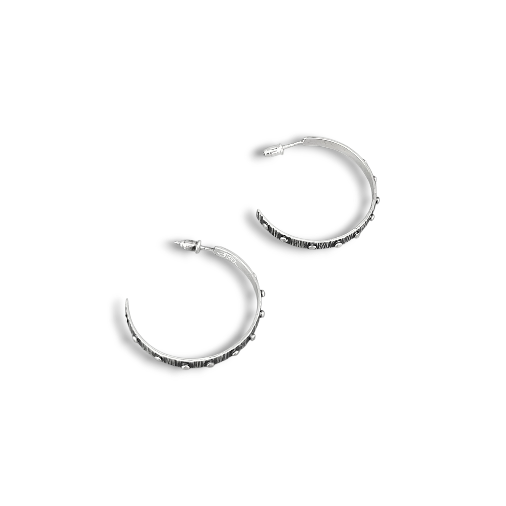 Large sterling silver hammered hoops with a dot design. Patina added for contrast.