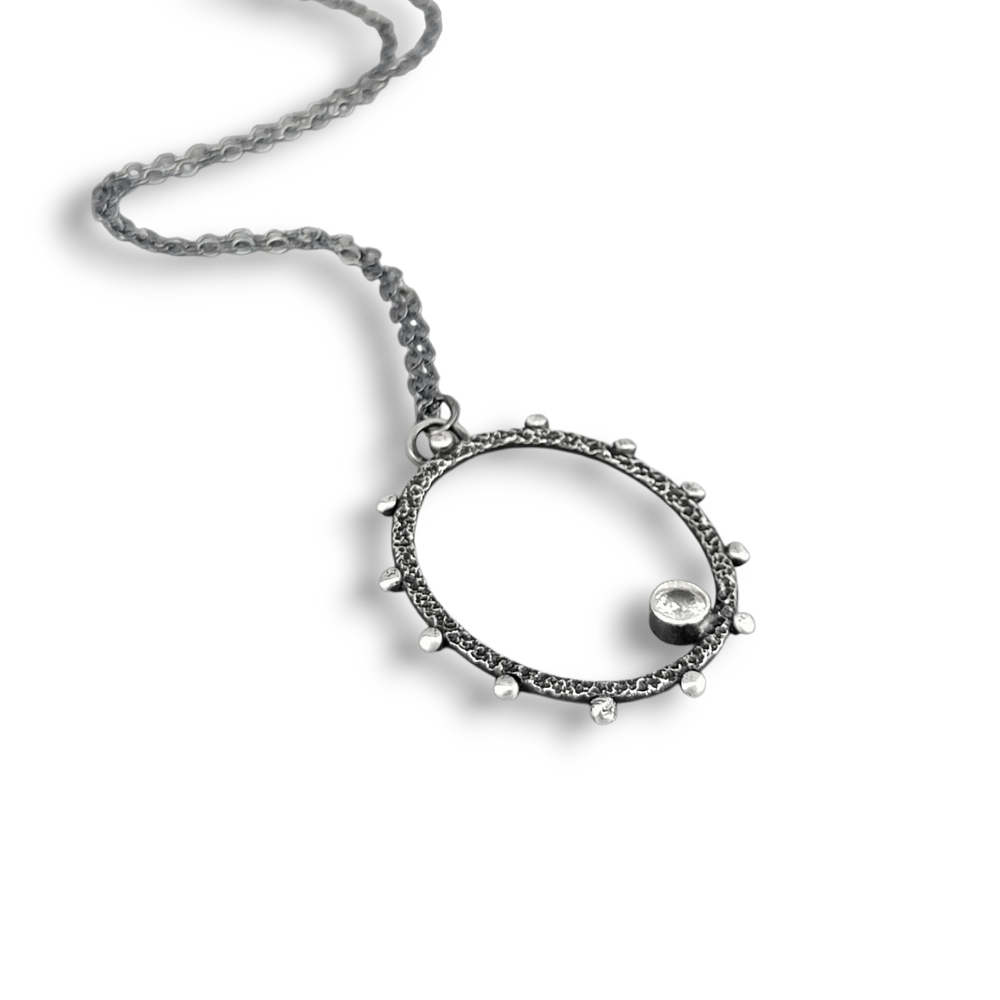 Argentium silver pendant with 4mm white topaz. Texture and patina added for contrast. Includes a 16" sterling silver chain.
