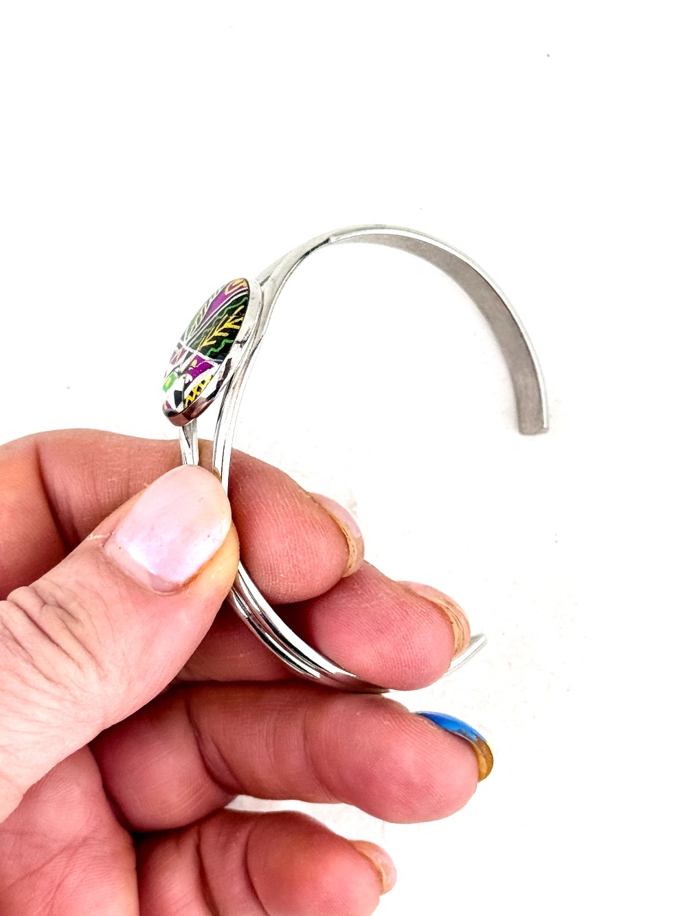 Silvertone Cuff bracelet, Mosaic of Goose eggshell (3/4")