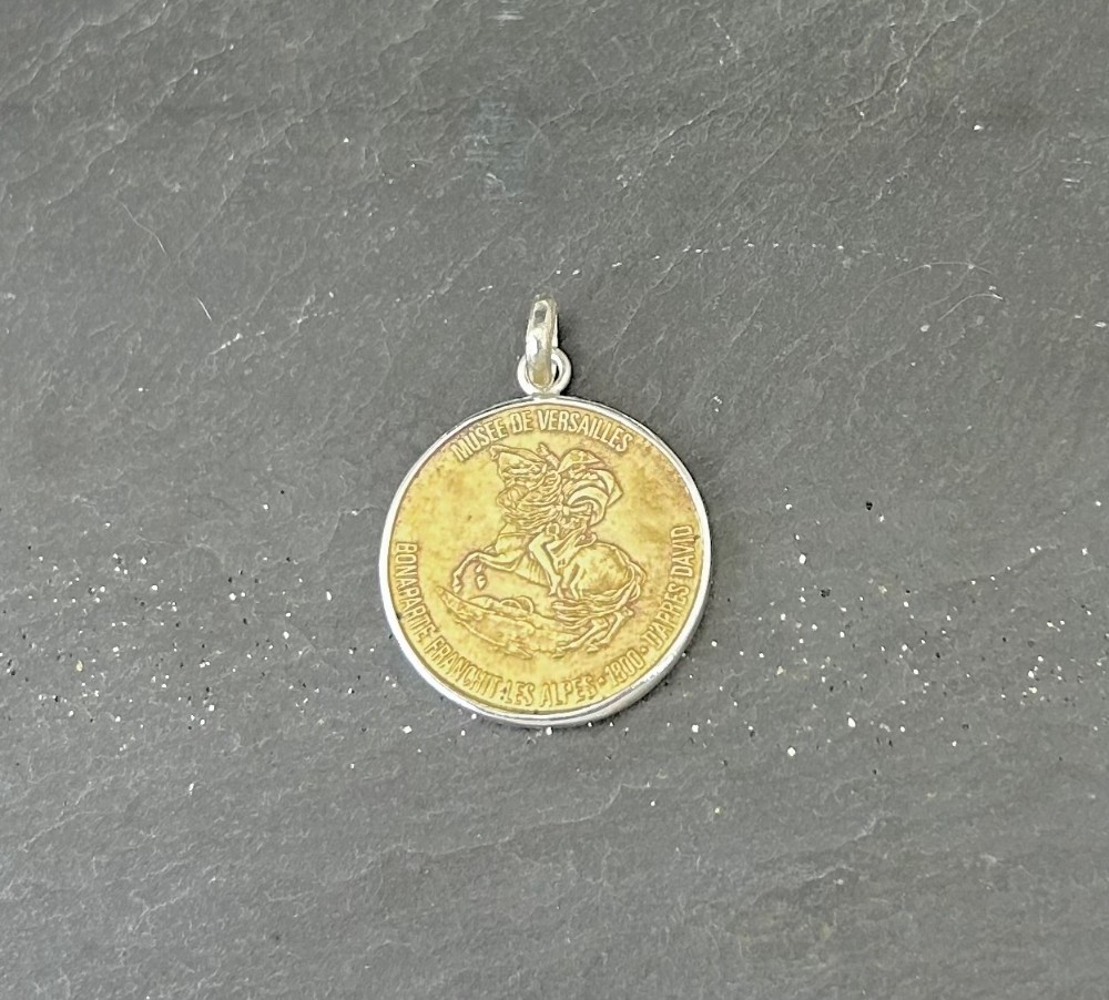 1969 French coin with Napoleon on one side, and an insect on the other. made of brass? and set in sterling/fine silver.