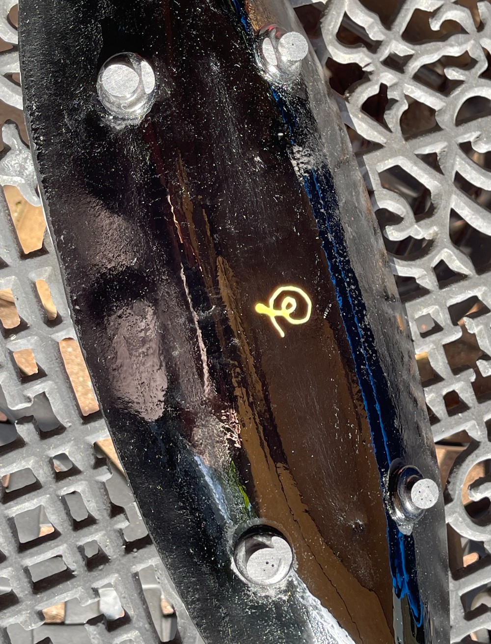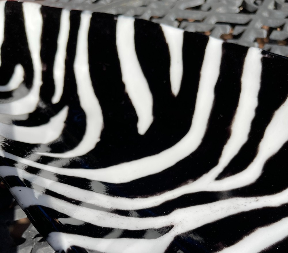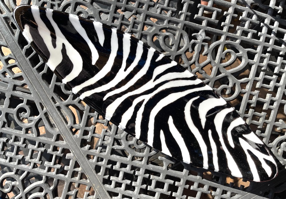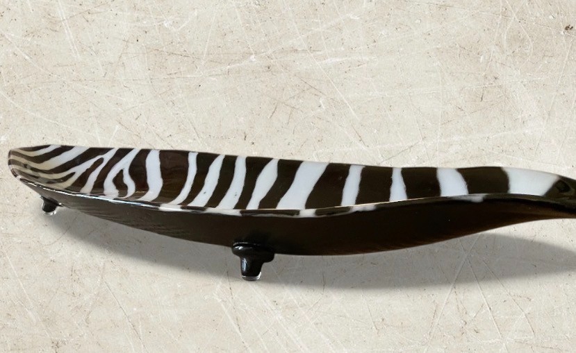 This substantial, long oval platter in a traditional zebra print measures approximately 24"L x 6.5"W x 2"D. It is propped up on four glass feet that have been bumpered with rubber pads to avoid slippage on any surface. This platter is a piece of functiional art, signed by the artist, which would be the center of any display cabinet or coffee table in your home. The glass is food-safe and is best suited for room temperature foods such as fruits. Alternatively, simply enjoy it as a one-of-a-kind piece of glass art.