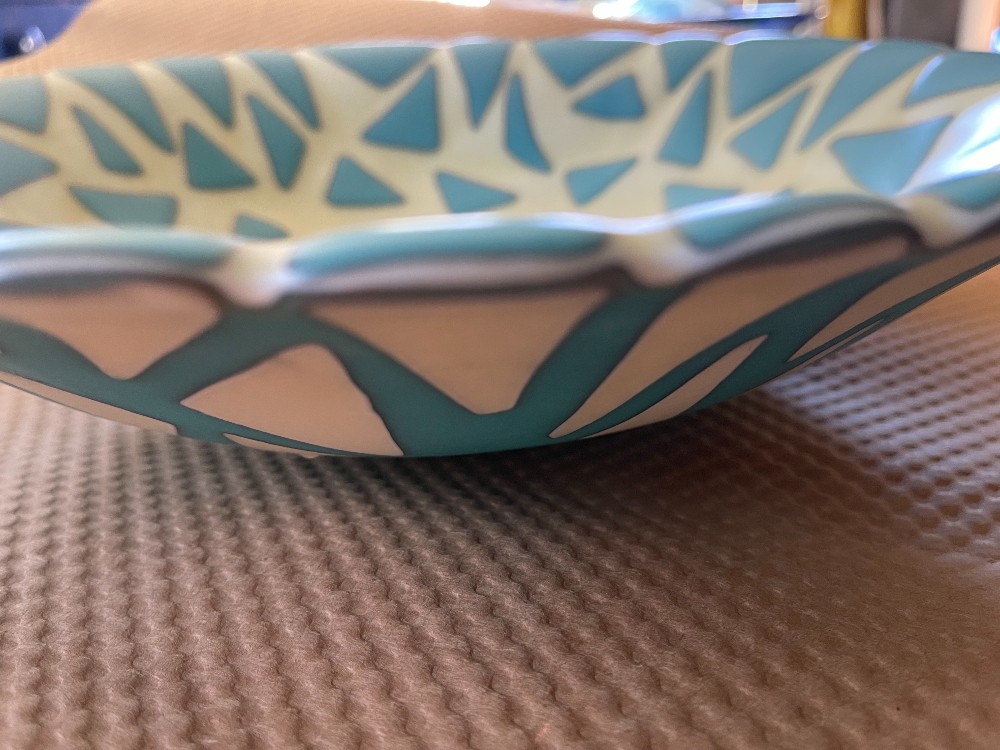 This beautiful two-tone glass bowl with its flip-side contrasting colors will delight you for years to come. The French Vanilla and Turquoise glass reacts and forms a slight outline which enhances the dramatic appeal, This bowl is not recommended for use in ovens or microwave ovens. Although it is dishwasher safe, handwash is preferred. Dimensions : 14" dia x 3" deep.