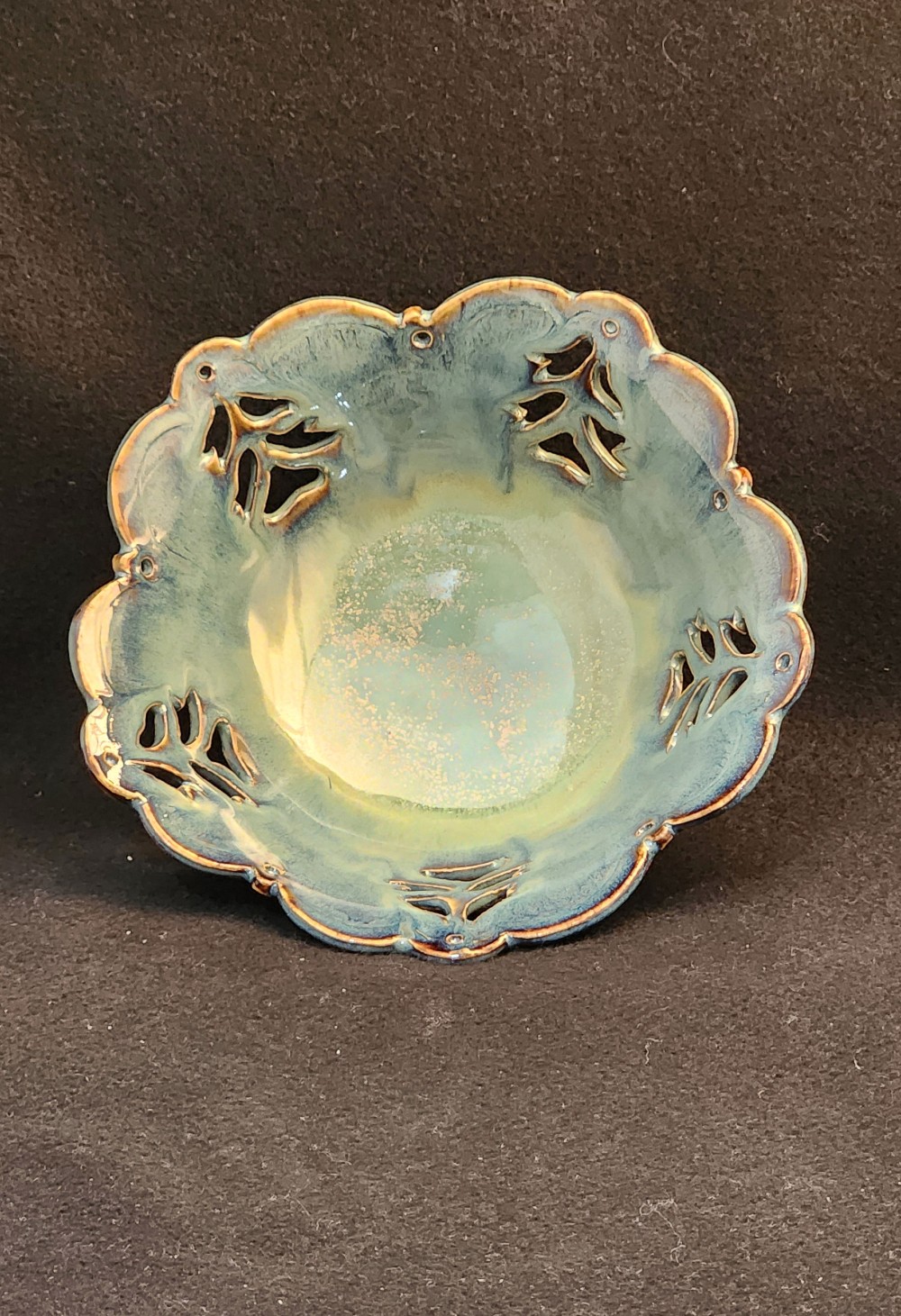 porcelain bowl 7" high X 3" tall carved rim accenting pierced evergreen trees