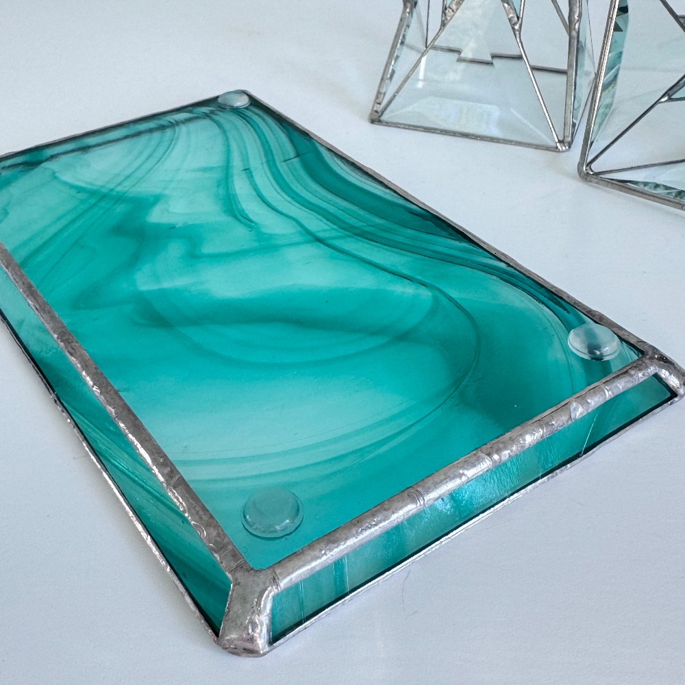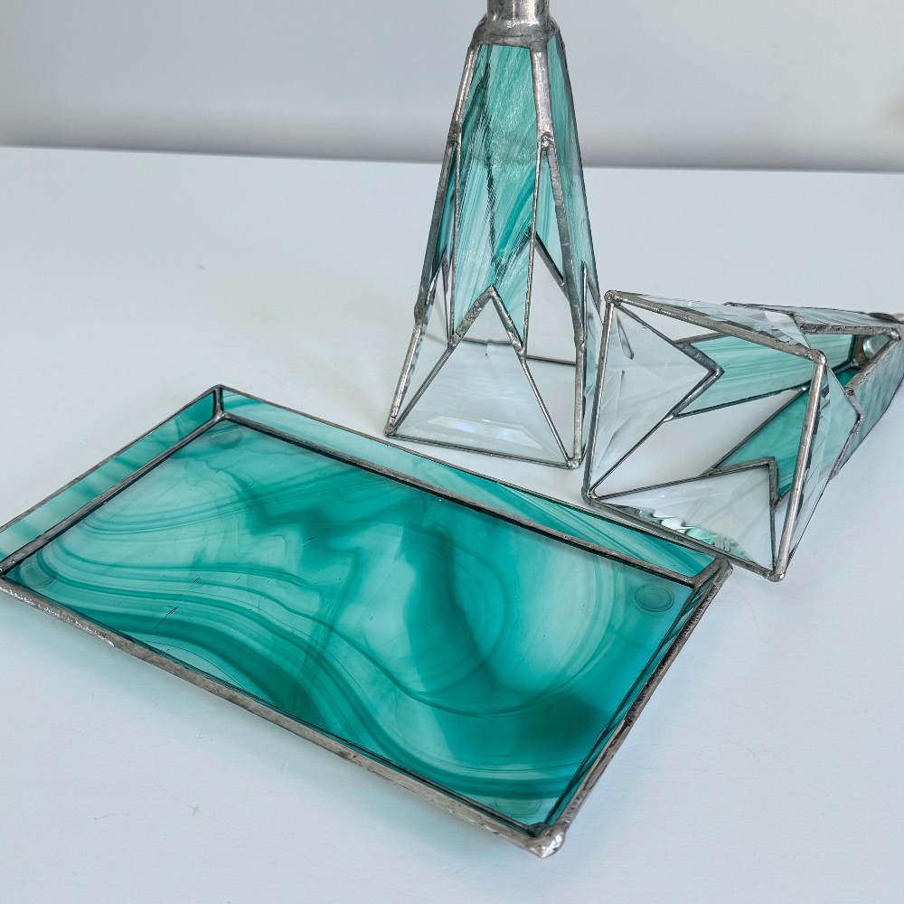 Bright turquoise Baroque stained glass sit atop triangle bevel, this set of 2 Stained Glass Candle Stick holders is hand crafted of bold bright turquoise swirled on clear baroque stained glass and statement-making 3" clear triangle bevels. The set of two candlestick holders sit on a turquoise and clear baroque stained glass tray that matches the candle sticks. The set would make a fabulous hostess, wedding or housewarming gift.