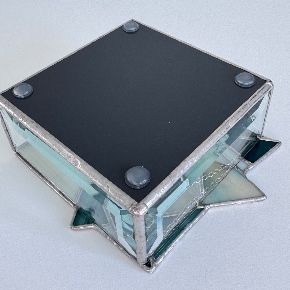 The box measures 5" by 5" by 2" tall. Sides are clear glass bevels and the bottom is mirror to reflect light thru the lid. The hinge is hidden and a silver tone chain keeps the lid from falling backwards. The box is created in the copper foil method of stained glass construction and the solder lines are left in their natural silvery tone and polished to a shine.