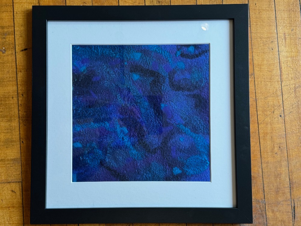 The fiber painting has a completely finished back with dust cover and picture wire.