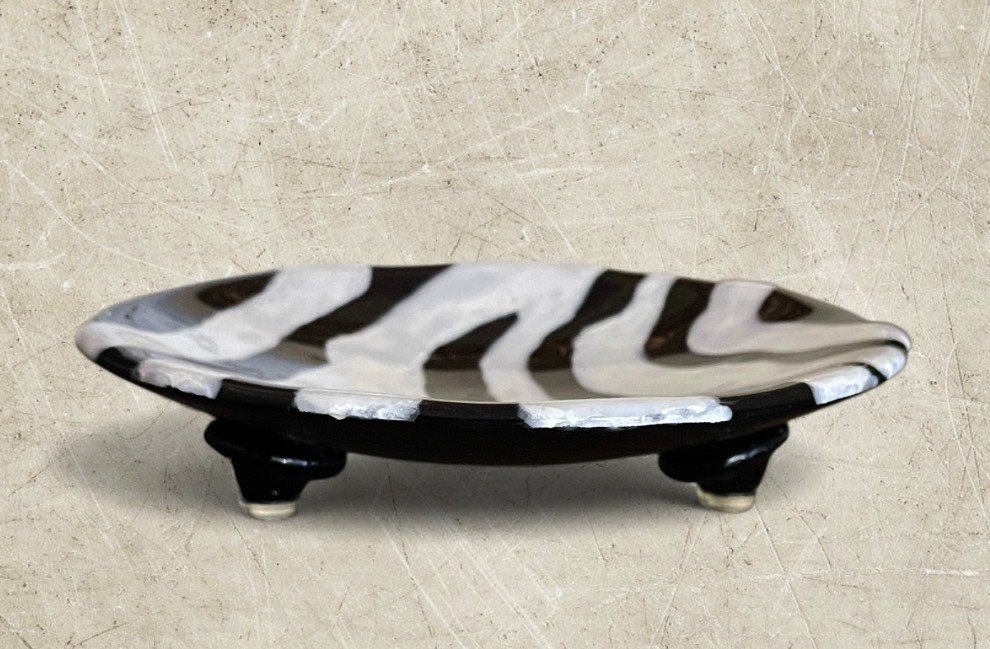 A one-of-a-kind, artist-signed, zebra-print trinket bowl in the animal print series. This food-safe plate is elevated on 3 small glass footpieces to lend an elegant flair to the functional art piece. Each footpiece has a rubber bymper to lend stability to the piece. It will liven up and draw the eye on any coffee table or bedside stand.