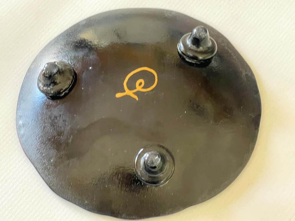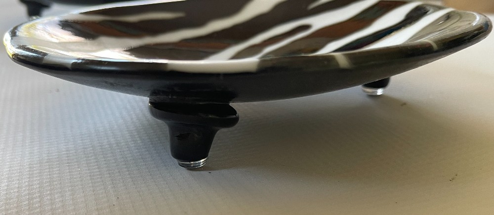 A one-of-a-kind, artist-signed, zebra-print trinket bowl in the animal print series. This food-safe plate is elevated on 3 small glass footpieces to lend an elegant flair to the functional art piece. Each footpiece has a rubber bumper to lend stability to the piece. It will liven up and draw the eye on any coffee table or bedside stand.