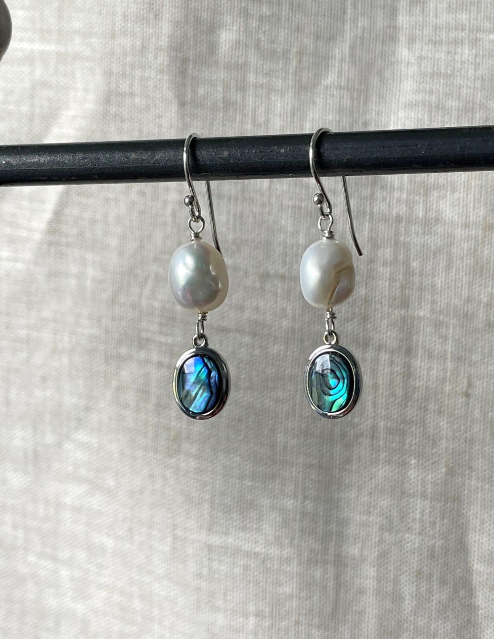 Freshwater pearl and blue mother-of-pearl sterling silver earrings.